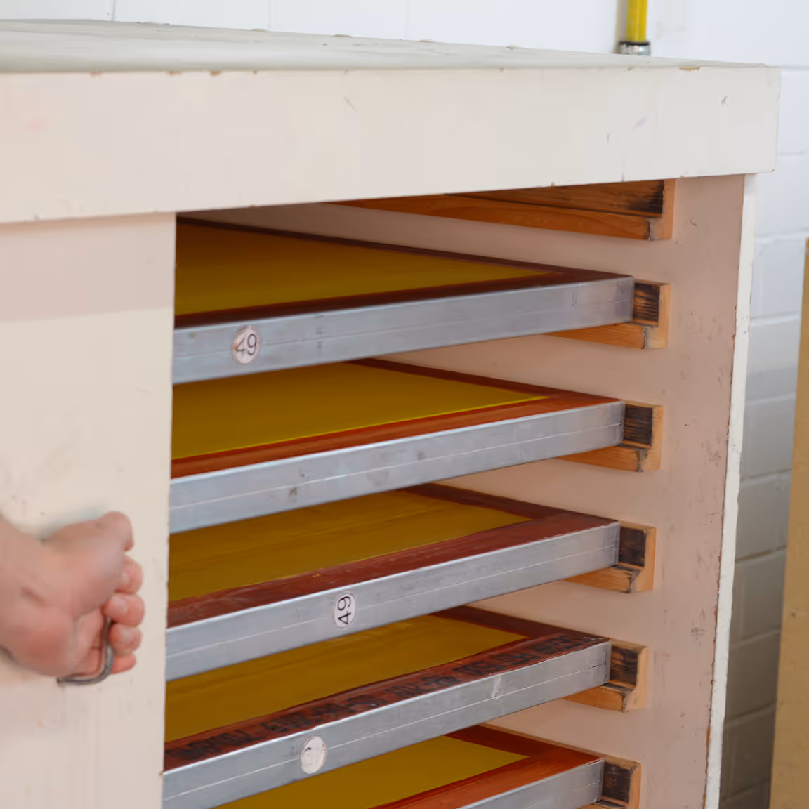 Jede Farbe erhält ihr eigenes Sieb, was besonders leuchtende und langlebige Drucke ermöglicht.